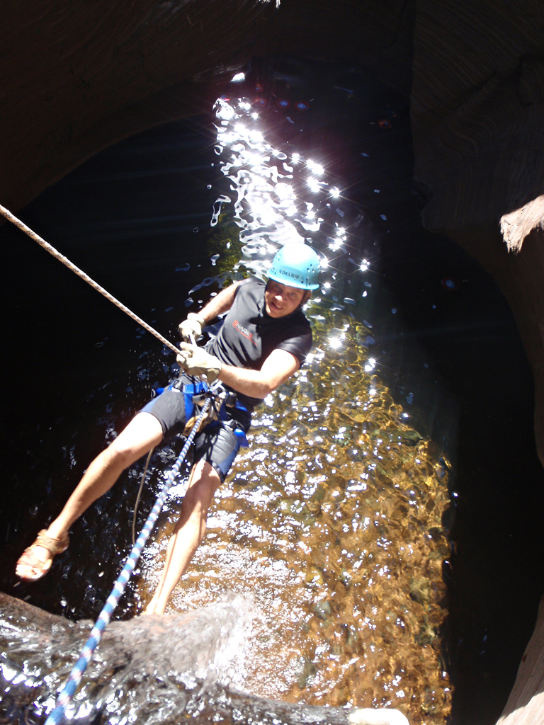 Ausgestattet mit einem Tube, Paddel und Seile ging unsere Tour am Morgen voller Vorfreude los. Bevor es allerdings los ging wurden wir erst mal mit Ausrüstung ausgestattet was wir für diesen Tag gebraucht hatten. Dazu gehörte ein Tube, Paddel, Neoprenanzug, Seile und Karabinerhacken sowie besondere Wanderschuhe die gleichzeitig auch fürs Wasser geeignet waren. Danach konnte es also nun endlich los gehen und wir haben uns auf den Weg runter in die Schlucht begeben wo wir als erstes an einem Fluss angekommen sind den wir auf unserem Tube und den Paddeln durchqueren mussten. Dies war schon sehr aufregend doch danach ging es erst richtig los. Wir sind teilweise direkt an den Felsen entlang gelaufen, an denen meistens nicht mehr Platz war zum Gehen als ein paar Zentimeter oder mussten uns durch enge Wege begeben.